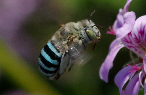 Blue banded Bee – Amegilla sp. is a beautiful and widespread native bee with bright turquoise bands across its abdomen (5 for males, 4 for females), lots of fluffy hair and large green eyes. Females build their own mud nest. Unlike Honey Bees and other native species ‘buzz pollinate’ – a flower ‘shivering’ motion that releases pollen held in small capsules and is necessary for a few native plants such as Hibbertia and very good for many crops.