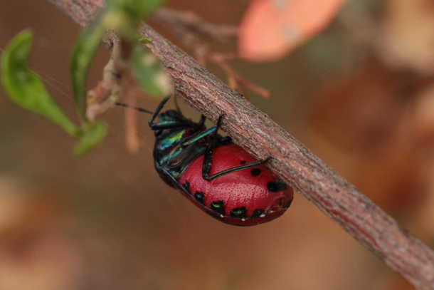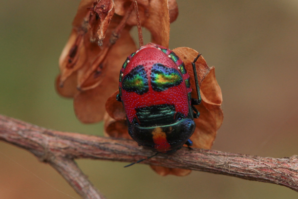 Shield-backed or Jewel Bug – Scutiphora pedicellata called ‘shield-backed’ because of the enlargement of the last section of their thorax into a continuous shield over the abdomen and wings. They feed on plant juices from a variety of species and, like Stink Bugs, omit an offensive odour when disturbed.