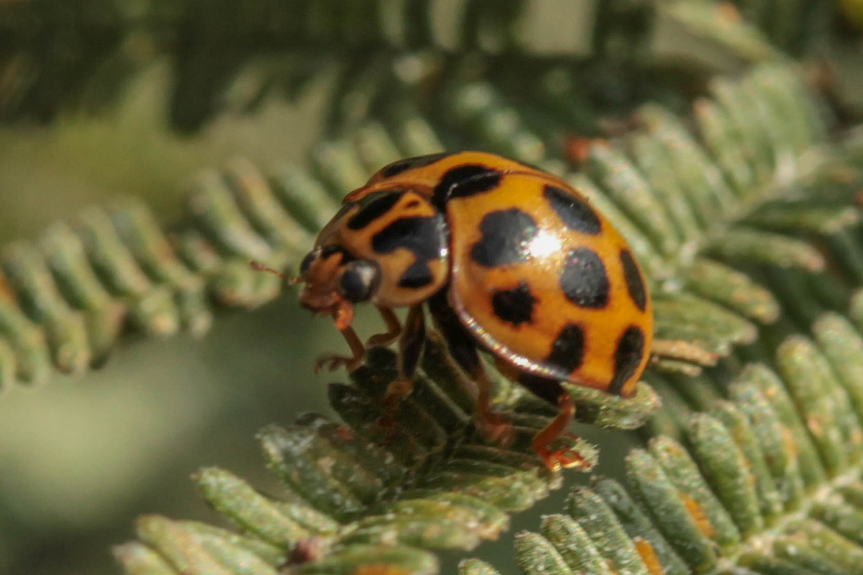 Common Spotted Ladybird – Harmonia conforms Ladybirds are small with a body length of 10mm-12mm, distinguished by their brightly colours and spots or stripes. They prey on aphids, scale insects and mites. A single ladybird larva can eat up to 100 aphids in a day! Here it is likely to be feeding on tiny white scale insects on an acacia.