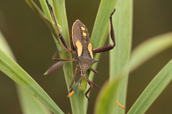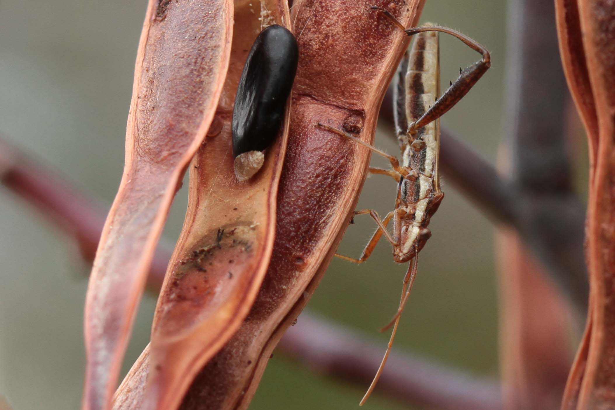 Pod-sucking Bug – Riptortus serripes Regarded as a pest by agriculture, this Pod-sucking Bug or Large Brown Bean Bug is native to Australia and distinguished by its yellow stripe along each side of its body. The adults are good flyers and feed on a wide variety of seeds with a preference for acacia. The four stages of instars resemble ants giving them some protection from predators.