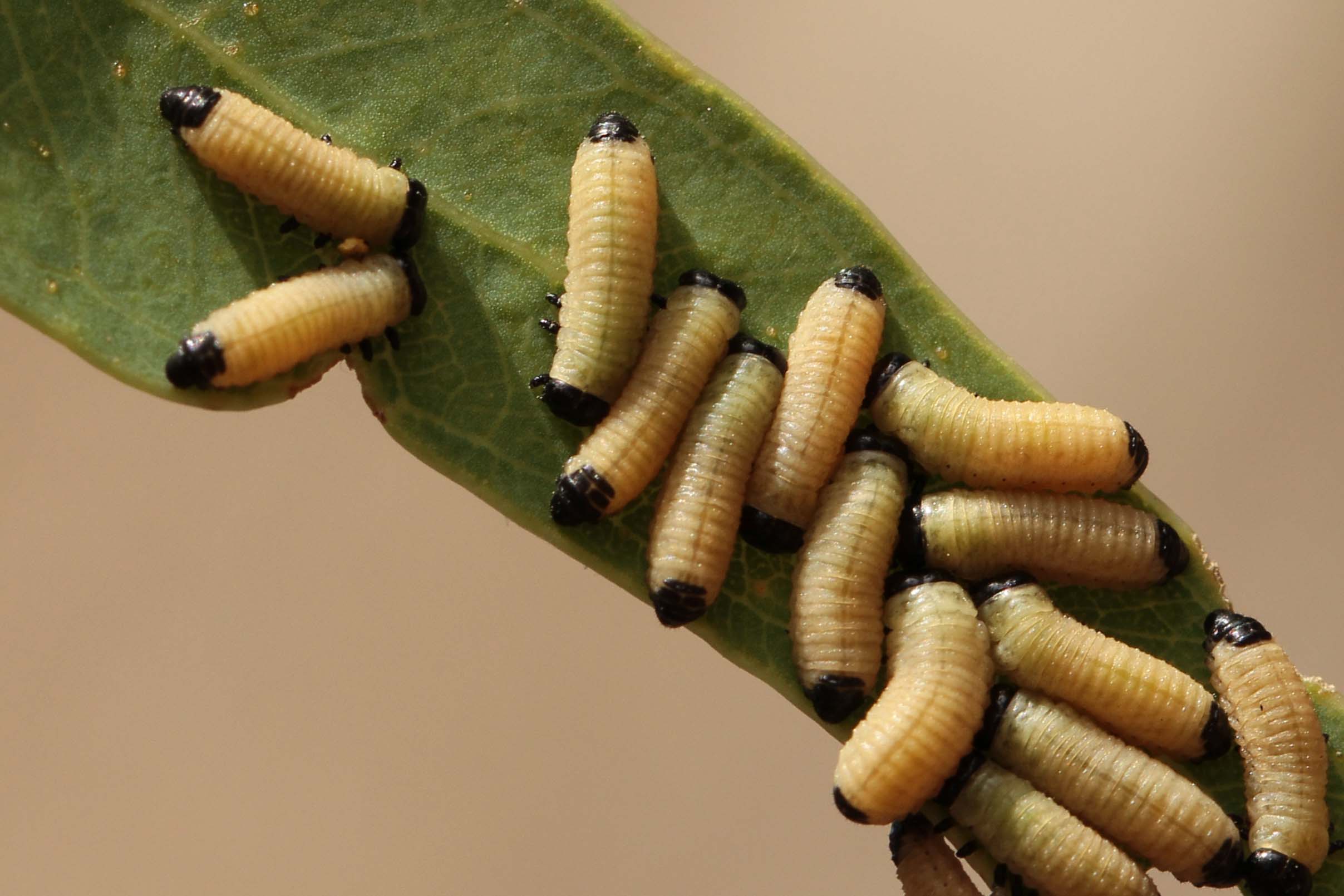 Eucalyptus or Tortoise Leaf Beetle – Paropsis atomaria produce two life cycles during summer. A females can produce 600 eggs and deposits them at the tip of a leaf or twig. The larvae feed on new growth but the adults prefer older leaves. The larvae can release a defensive liquid of hydrogen cyanide and eucalyptus oil if threatened.