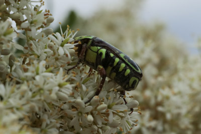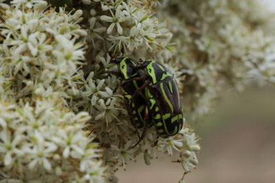 Fiddler or Horseshoe Beetle – Eupoecila australasiae The name ‘Fiddler’ comes from the green violin-shaped markings on the back of this beetle. It is common, large – up to 2cm – and native to south east Australia. It emerges from cocoons underground in early summer and feeds primarily on pollen. The grubs feed on rotting wood.