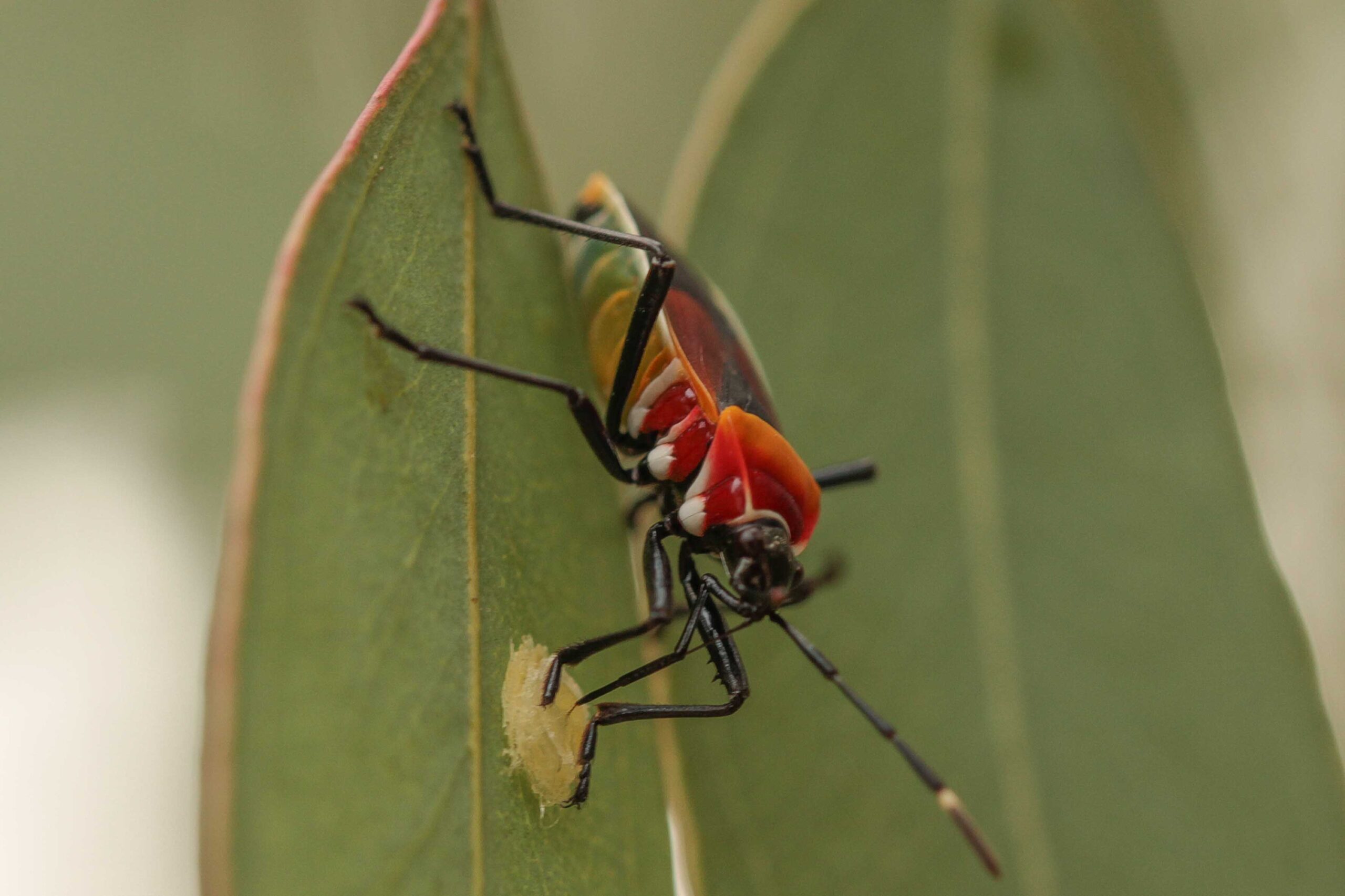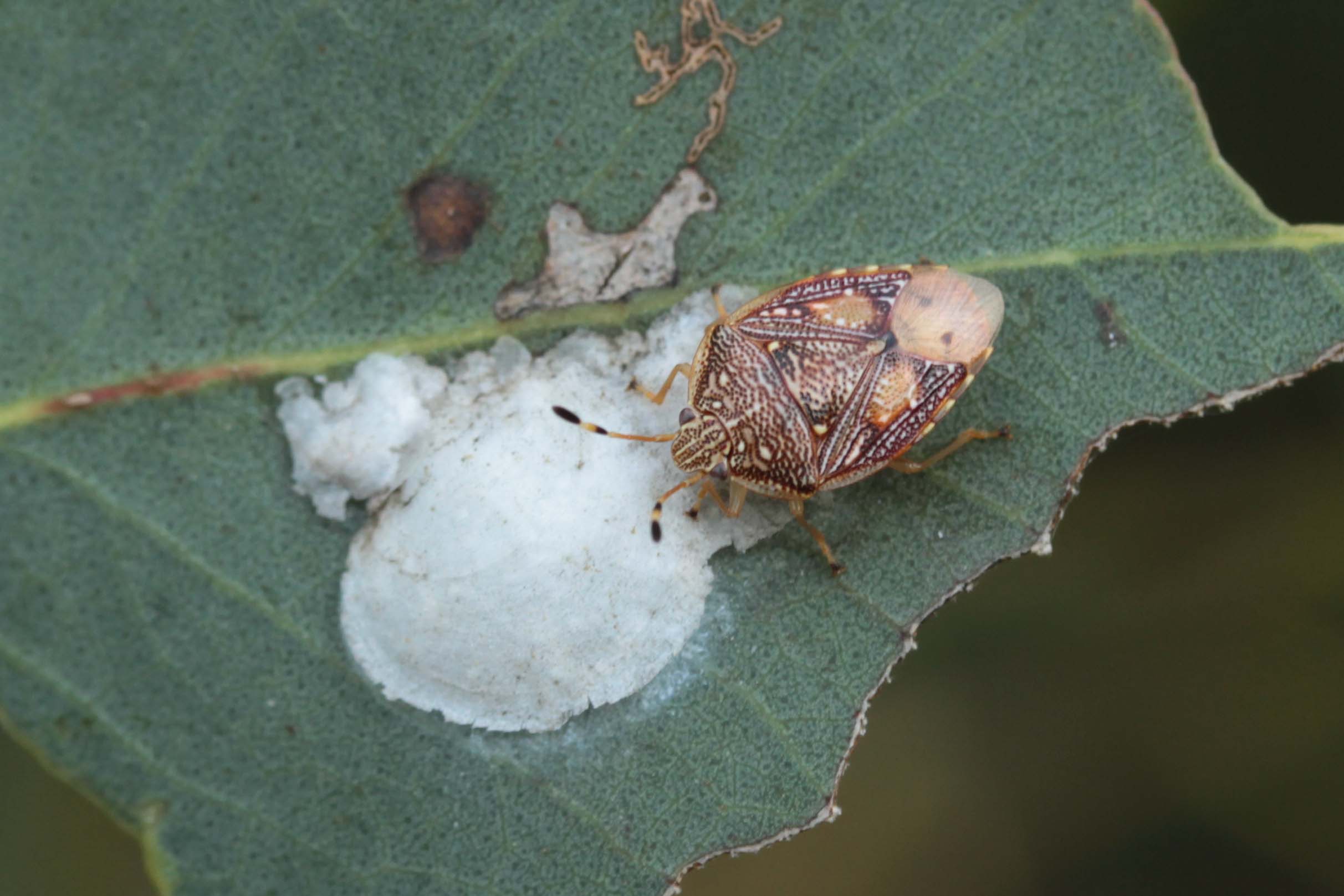 Shield or Stink Bug – Poecilometis feeds through a long tubular mouth with a sharp rostrum for piercing plants. Some are predatory and use their rostrum to spear prey and extract body fluids. It is possible that the bug in the first image is piercing the psyllid cover to get at the lerp insect within.