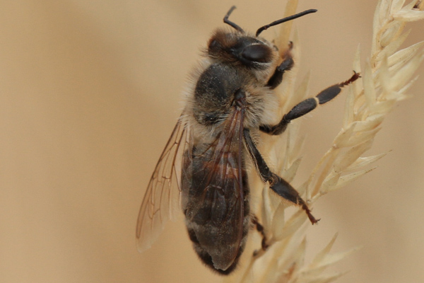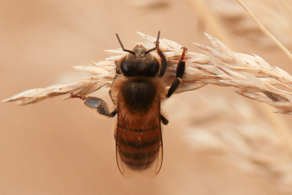 Leaf-Clutter Bee – Megachile sp. male This solitary bee is so called because the female typically snips neat round or oval shapes from leafs to create cells although some use resin for this purpose. Cells are constructed inside nests that have usually been burrowed into cavities like holes in stems of abandoned holes in wood. Eggs are laid in these cells, and each provided with a pollen and nectar mixture and the grubs will eat these provisions before pupating. The pollen collected by these bees is carried on long hairs on the abdomen where it more readily transfers to the next blossom making these bees productive pollinators. This male is probably Megachile tosticauda which roosts on grass stems, generally with other males with abdomens facing outwards.