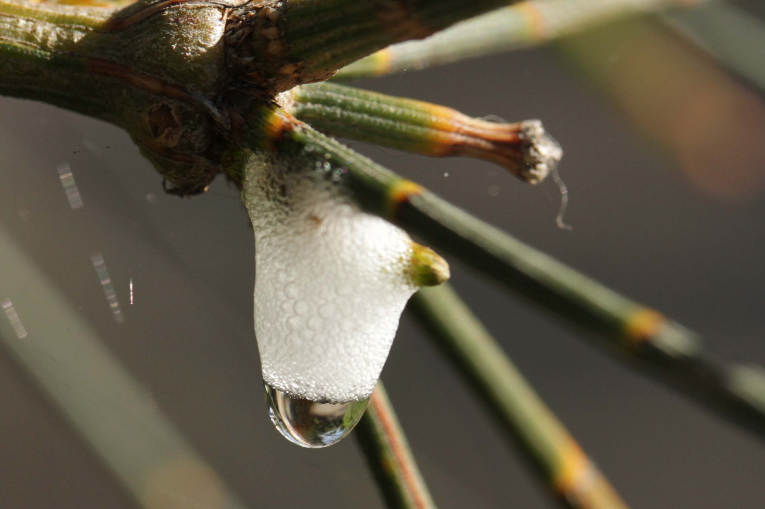 Spittle Bug – Pilagra parva nymphs attach themselves to a plant feeding on the sap and consuming so much water and carbohydrates that a liquid is secreted forming bubbles by moving or pumping their bodies. Their hind legs are used to cover themselves with the froth, giving them protection from predators, temperature extremes and dehydration. Eggs are laid in late summer left to overwinter on plant debris. The eggs hatch in early spring, the nymphs are wingless and almost invisible inside the spittle.