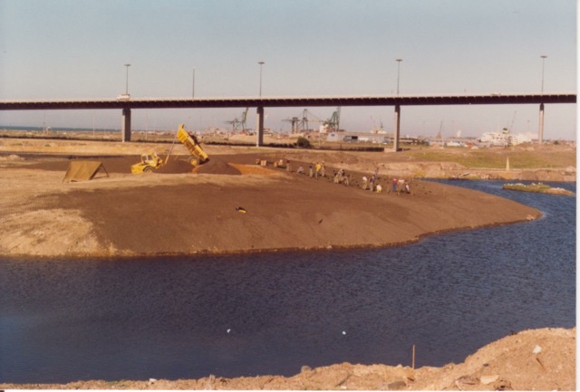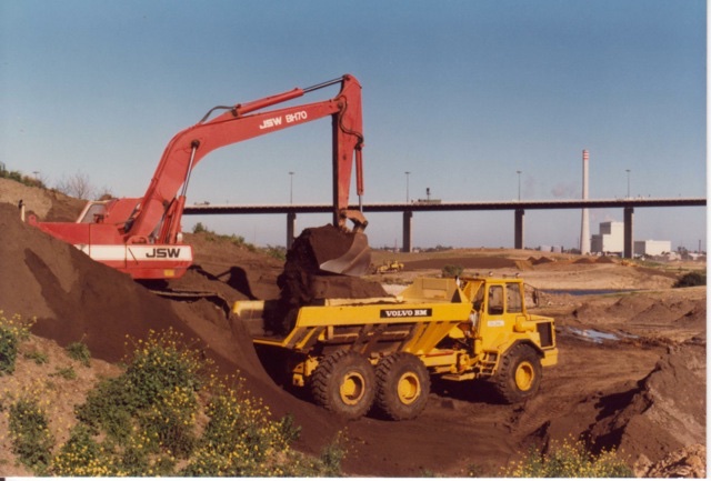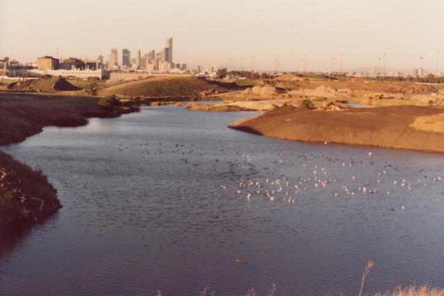 Before it was constructed by the Victorian Department of Conservation, Forests & Lands in the 1980s, the land that is now Westgate Park had been mined for sand, degraded by industrial processes and rubbish dumping and it was used as a construction site for the Bridge. Countless truckloads of demolition waste and soils of all types were brought in from all over Melbourne to shape the park into small hills and mounds, wetlands and lakes. It was initially vegetated with Australian plants but most were not indigenous and either died because they were unsuitable for the Melbourne climate or became weedy. (These have provided limited shelter, especially for birds, and so are being removed only as indigenous plants mature and can take their place.)